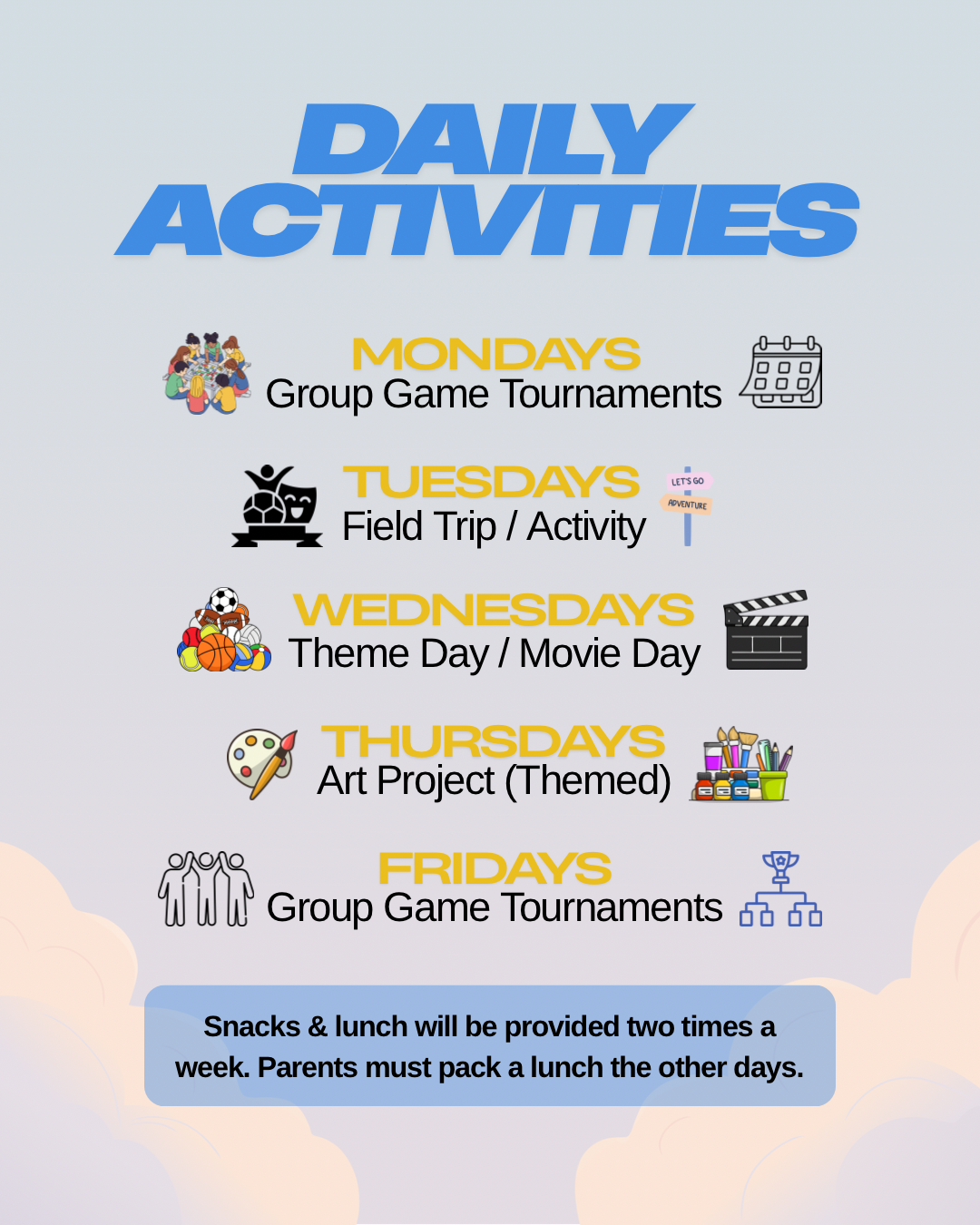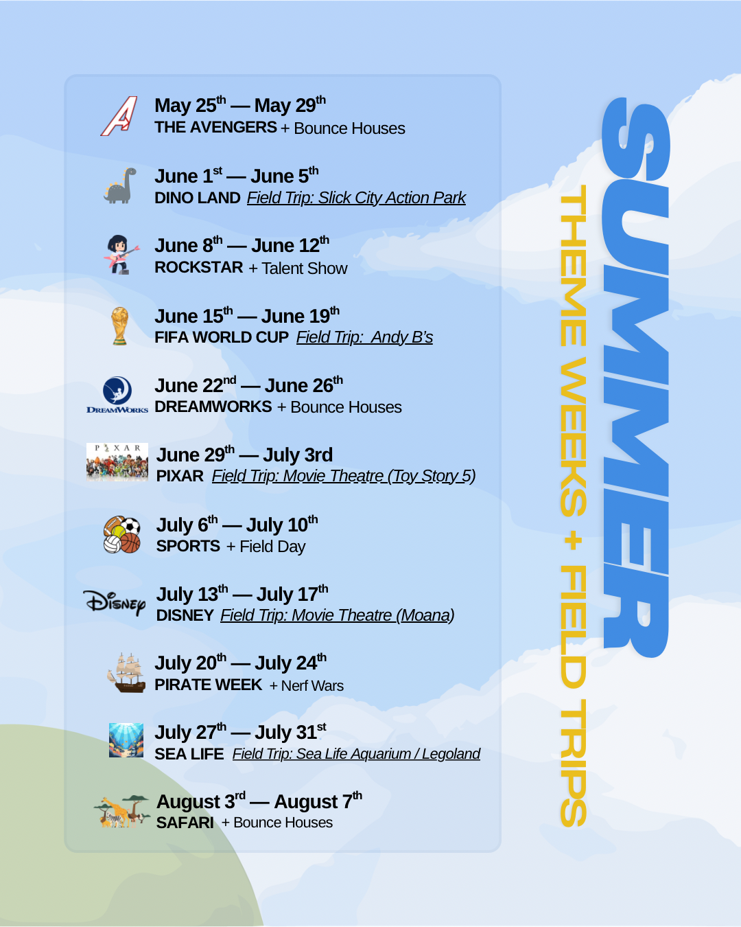 Includes all 11 weeks from May 25th — August 7th, 5 days a week