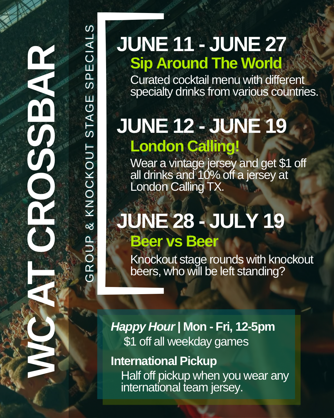 Get ready for all the action of the FIFA 2026 World Cup! Join us for our themed weekly watch parties and reserve your spot to watch your favorite team.